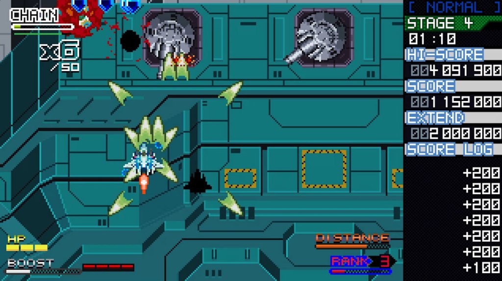 As for the gameplay, apart from the main gameplay twist I mentioned before, there’s… not too much else going on here. This is a decent Shmup, and I would argue it’s even pretty good, but there’s very little it does that truly sets it apart. Even the power-ups feel pretty uninspired, and the power-up/power-down mechanic doesn’t seem to matter too much when power-ups are extremely plentiful.