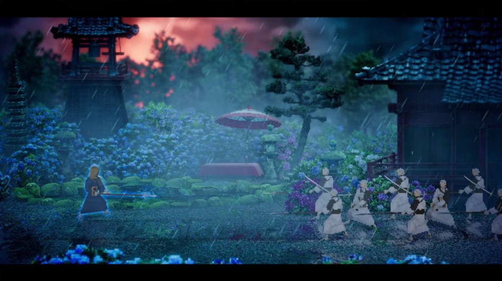 One thing you’ll notice right away when playing Amedama is that this game is absolutely gorgeous. It uses an art style that might be compared to the HD-2D style Square Enix has popularized in its games, but there are distinct differences. In addition to the beautifully-detailed backgrounds, the human characters are either extremely fluidly-animated 2D characters, or more likely 3D characters with a sort of pixelization filter placed over them to make them look like 2D characters. Whichever it is, the results are striking, and this is joined by gorgeous-looking puddles being spattered with rain. All of this is backed by a soundtrack composed of traditional Japanese instruments, befitting the game’s setting.