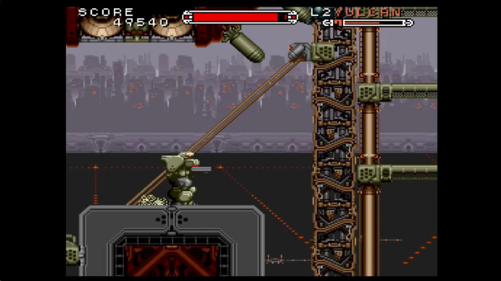Having said that, the controls in this game are still extremely clunky, and you’ll frequently have to deal with the frustration of your mech not acting how you want it to. You’ll also have to deal with your mech’s gun having an extremely frequent need to reload/cool down, interrupting your attacks at the most inconvenient time. This issue on top of enemies often being bullet sponges may well frustrate you into just swapping to melee attacks, which are somewhat more reliable, but can also make it easier to take damage. On top of this, the Shmup sections are outright terrible, with players having a massive hitbox and with enemies still being bullet sponges leading to repeatedly taking damage that seems unavoidable.