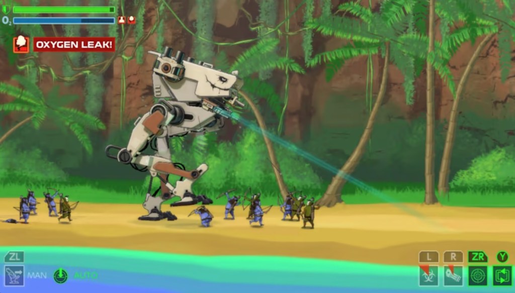 Your weaponry, for example, overheats quickly and takes a painfully long time to become usable again. Meanwhile, attacks by the natives not only whittle away at your mech’s armor, but they can also drain your oxygen, giving you two separate health bars to worry about, with either one depleting leading to a game over.