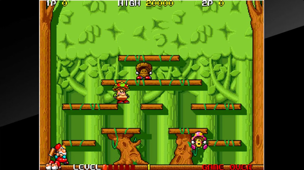 Don Doko Don plays very similarly to the classic game Bubble Bobble, with players clearing out screens of enemies to progress, here as a hammer-wielding lumberjack. While this game is visually well beyond what we saw in Bubble Bobble, it’s more difficult due to both your limited range and the way enemies can easily swarm you. In addition, the platforming here isn’t great. It’s still enjoyable, but it doesn’t feel like a step up from Bubble Bobble. Oh, also, the music is terrible.