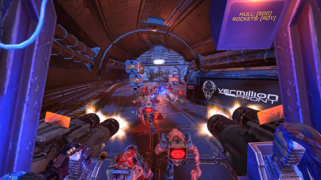 Turbo Overkill is a First-Person Shooter released on PC in 2023 and then ported to PlayStation 4, Xbox One, and Nintendo Switch in 2025. Set in a gritty, cyberpunk-style future, you take the role of a cyborg mercenary working to take out an AI controlling an army of violent freakish half-machine creatures that aims to spread its control to the entire world.