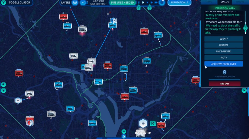Apart from a title screen that uses 3D visuals of people milling about in a command center, the presentation here is much the same as the original game, using 2D wireframe maps to represent the city’s roads and facilities, with emergency responders represented by icons. This is backed by subdued, serious-sounding music joined by radio chatter that fits the theme quite well.