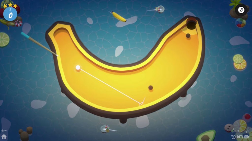 Pocket Pool, released in 2022 on Nintendo Switch, is nominally a Pool game, but in many ways it seems closer to Mini-Golf. You’re still aiming your cue ball at one or more balls you’re meant to sink into a pocket, but in this game the tables are various zany shapes, with all sorts of ramps and moving obstacles in your way.