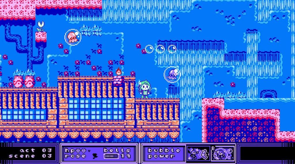 One thing Belle Boomerang absolutely nails is its retro look, which has a nice 2D pixel art style using a limited but changing color palette that’s strongly reminiscent of some of the better classic Nintendo Entertainment System games, with Kirby’s Adventure seeming particularly similar. This is paired with a chiptune soundtrack that’s nothing special but fits the look of the game perfectly.