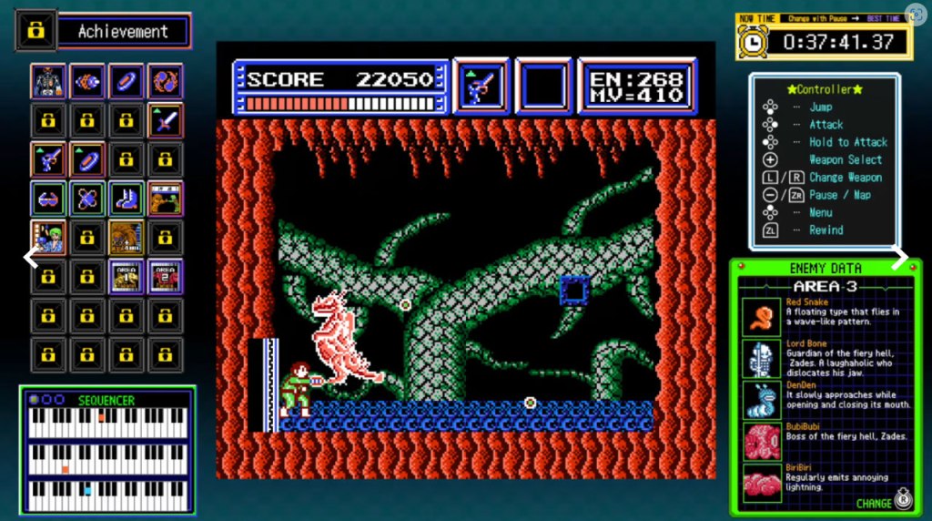 Despite that Bio-Warrior Dan wasn’t even a significant enough release to even get localized when it first came out, the Nintendo Switch version of the game has gotten a lot of love. This release comes with a gallery of box art, instruction manual art, promo art, behind-the-scenes making-of documents, achievements to pursue, a quick save feature, a rewind feature, display and control options, and a frame that includes helpful gameplay info and a synthesizer display showing the music being played in real-time. This is far more than I would have expected for such a niche game.