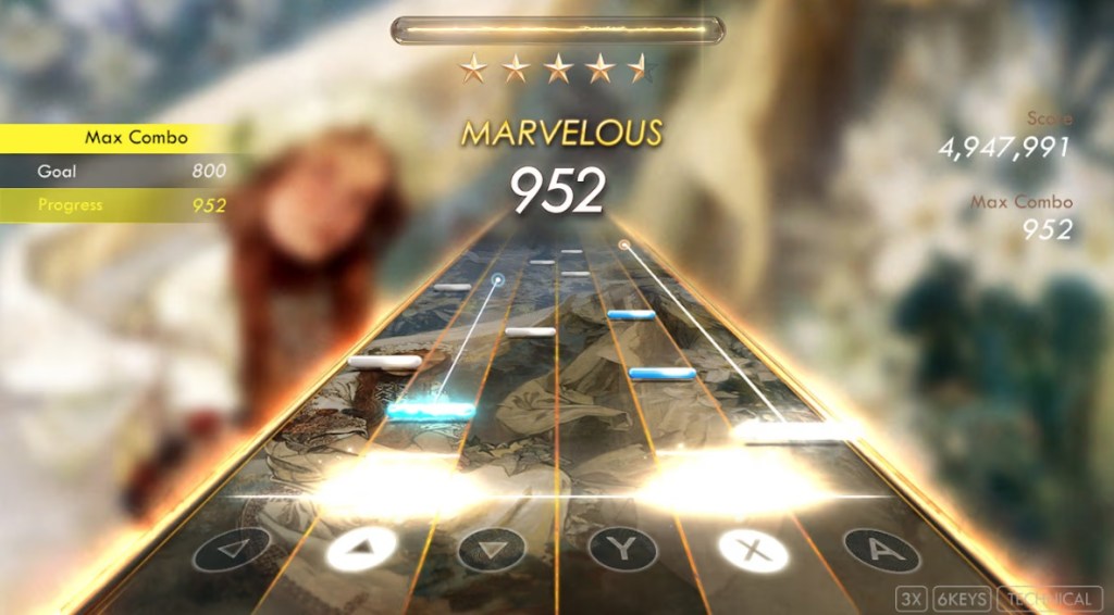 The gameplay here is pretty straightforward, following the same Guitar Hero-style gameplay that Deemo does – notes fall down the tracks, and you need to press the corresponding buttons when they reach the bottom. Players are offered not only three difficulty settings, but they can also select a four-button mode and a more challenging six-button mode, with the former using left and up on the D-pad and X and A on the face buttons, while the latter adds right on the D-pad and Y on the face buttons.