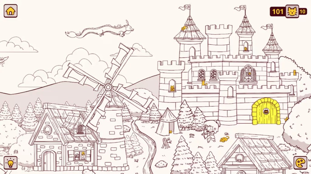 The presentation here makes use of cute, cartoony 2D line art with minimal animation such as rotating windmills. This is backed by thematically-fitting “Renn faire”-style music, and joined by meowing sounds every time you uncover a cat. These sounds get annoying pretty quickly, but thankfully you can change the sound settings so you don’t have to keep listening to it.
