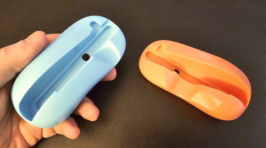There’s a hole in the bottom of each to allow the mouse sensor on the Joy-Con 2 to detect the surface it’s moving across, and notches to make space for the analog sticks, release buttons (they’re not used here, but they still take up room), and the minus button on the left Joy-Con 2 controller.