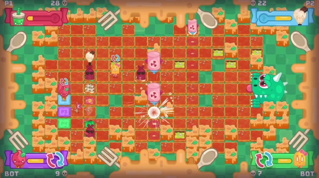 The presentation uses simple, cartoony 2D visuals with a cutesy art style and a lot of color, with a wide variety of different sweet treats to choose from as their character. This is backed by an energetic, whimsical soundtrack that works well enough for the frenetic gameplay.