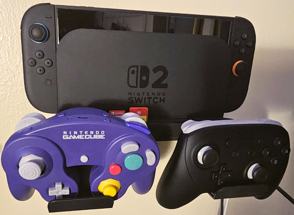 The arms of the unit will hold two Pro-style controllers, including most first-party and third-party controllers such as the Nintendo Switch 2 Pro Controller, as well as Nintendo Switch Joy-Con 2 Grips. However, controllers with a shape that deviates from the standard may not fit quite as well – for example, the Nintendo GameCube Controller for Nintendo Switch 2 technically fits in one of these, but feels precarious, like it could easily fall out.