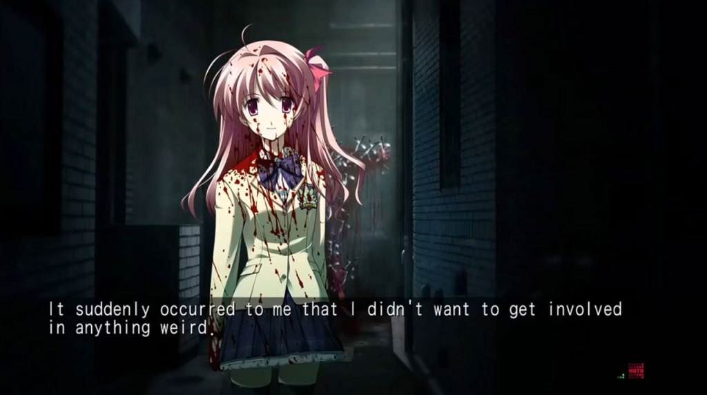 This game puts players in the role of Takumi, a high school student who is an extreme recluse. Takumi would be perfectly happy to just stay in his cargo container home all day playing videogames, but soon he finds his life tangled up with a case involving a gruesome series of murders happening in the area. At the same time, Takumi is forced to contend with “delusions” that his life may not be as it appears, and these delusions turn out to be even more significant than they initially seem to be.