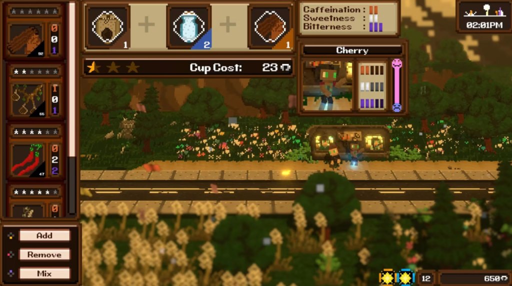 While you might hope that the gameplay could compensate for this, sadly the gameplay is pretty poorly-made as well. You have a growing number of ingredients to purchase to make the drinks you serve customers, with different ingredients adding different levels of caffeination, sweetness, and bitterness, to appease the tastes of different customers… but all this seems to do is change their responses to what you serve to be more positive, it doesn’t increase the price of the drink or have any sort of tangible effect on how well you do in any way.