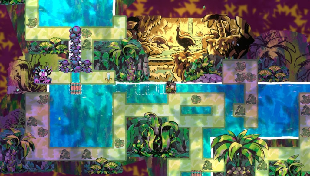 Despite featuring tile-based 2D visuals, the world of Arranger is surprisingly beautiful. It’s bursting with color, and with some really expressive cartoony character designs, and with the borders of the traversable areas you move through surrounded by still images depicting the environment, characters, and scenes taking place around you as you move. It’s all quite striking, giving this game a really unique look that works really well for the game. This is joined by a soundtrack filled with lovely plunky strings and drums, with great songs like Once Upon a Tile, Taking It Breezy, El Mundo se Mueve Conmigo, and A Tile as Old as Time, to name a few.