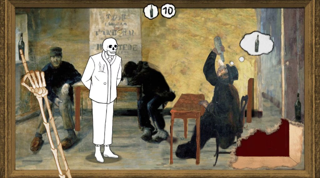 To connect these artworks together, players will be taking the role of a roughly-sketched suited skeletal figure, with the gameplay having a lot in common with Graphic Adventure games, with players using a cursor in the form of a skeletal hand, or the touchscreen, to interact with objects. You’ll be moving through the environments, searching for hidden objects at the behest of characters within said environments, and occasionally doing other puzzles, like patching up damaged paintings via a continuous line puzzle.