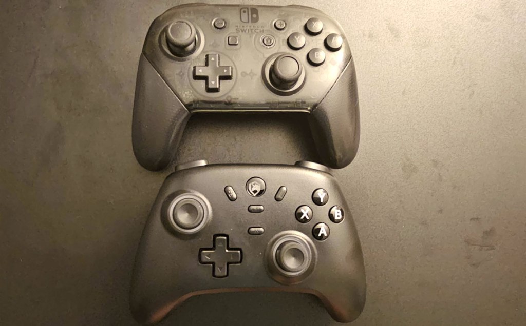 As with many of the Pro-style controllers released for Nintendo Switch, the EP01 is pretty comparable in size and shape to Nintendo’s own Nintendo Switch Pro Controller, with a mostly-comparable button layout (albeit with the face button labels reversed in a standard PC/Xbox layout, which doesn’t affect functionality but may cause confusion when playing Nintendo Switch games), as well as asymmetrical analog stick placement. However, the EP01 weighs less, and has textured grips.