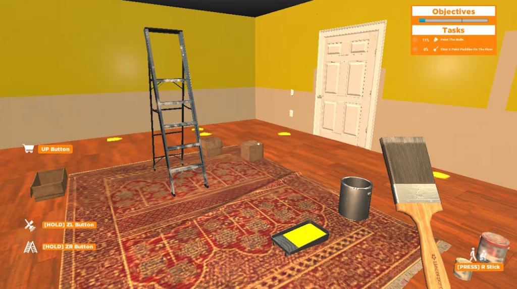 Oh, that’s another thing – this game locks players’ tools behind progress, and things like paint rollers are unavailable at the start. What’s more, while there’s an equipment wheel that lets you select among the various tools you can use, it doesn’t indicate how to select which one of a particular type of item, meaning that when I was selecting brushes, it just randomly assigned me a brush to use rather than letting me pick. Bizarre.
