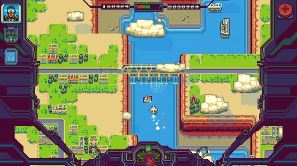 Beyond the occasional missile, the biggest risks you’ll encounter are running out of gas, and splits in the river you’re traveling on where one path is instant death. For the former, you have a gas gauge constantly ticking down, and you can refill this gas by moving over grey aircraft carrier ships, something the game fails to convey to the player. These ships are so frequent it shouldn’t matter if you miss one or accidentally shoot one down, there will be another one soon enough.