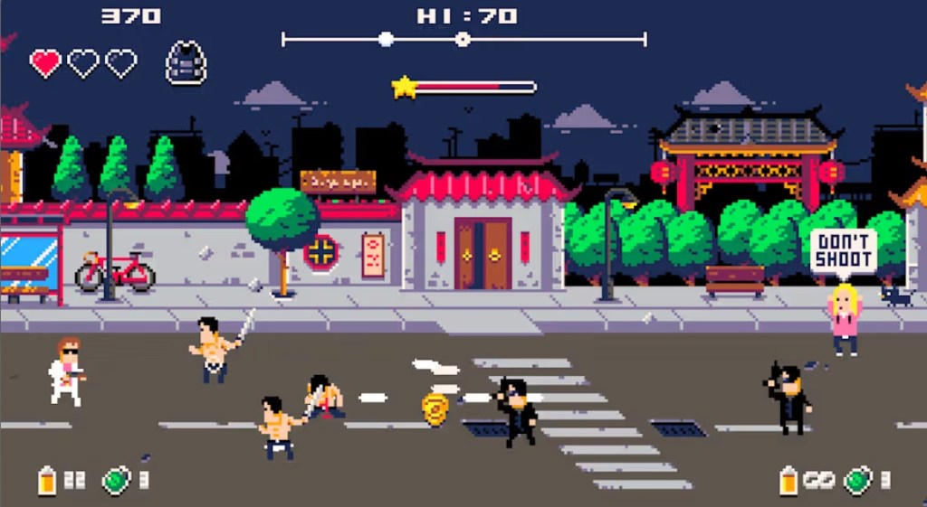 Donuts’n’Justice is an Arcade-style game released in 2016 on PC and ported in 2021 to PlayStation 4, Xbox One, and Nintendo Switch. This game has players moving on a scrolling street from left to right, trying to gun down criminals while avoiding hitting bystanders.