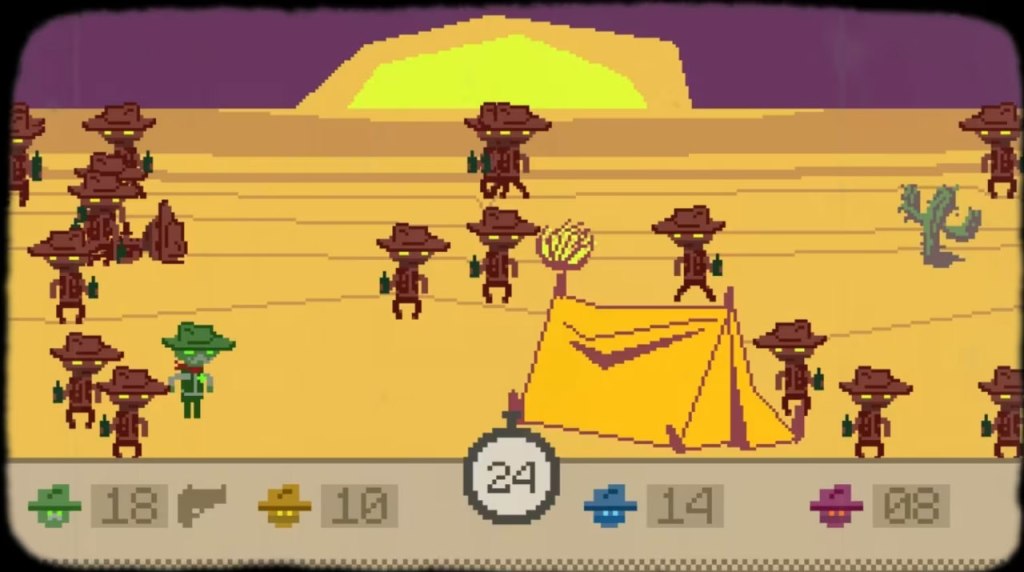 The gameplay is split into three modes – the standard Thief Town mode, Spy Town mode, and Drunk Town mode. Thief Town and Spy Town work largely the same, with players trying to take each other out while remaining hidden from other players, trying to mask their movement by moving like the identical-looking computer-controlled characters, with Spy Town just adding randomized special weapons into this mix that do various things. Drunk Town, on the other hand, selects one player to be a sheriff, who must discern who the real players are and shoot them with only a limited supply of bullets.
