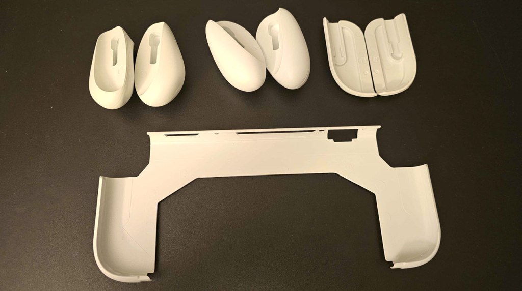 The case comes in seven pieces – a horseshoe-shaped main case cover, and three pairs of interchangeable grips that attach to two protrusions on the backside of the Nintendo Switch 2. These protrusions are right where your fingers would fall and they’re uncomfortable, so I don’t see players using this case without a set of grips attached at all.