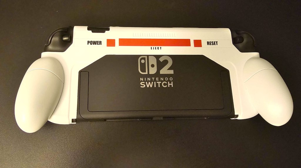 Speaking of look, the creators of this case made the odd choice of adding an orange bar to the back of the unit with labels “Power”, “Eject”, and “Reset”. While this gives the case an odd retro-futuristic design, it’s worth noting that there aren’t any functioning buttons here, and these words don’t correlate to any of the buttons on the Nintendo Switch 2 itself – “Power” is nowhere near the actual power button, and Nintendo Switch 2 doesn’t have “eject” or “reset” buttons.
