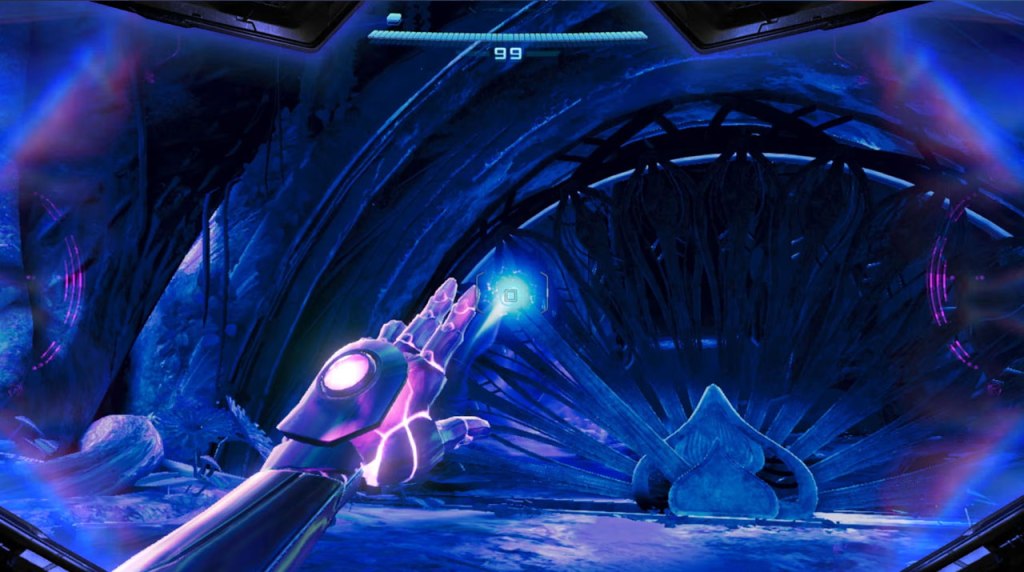 It’s not just on a technical level that Metroid Prime 4 impresses, either. The visual design here is amazing, with some really imaginative architecture, fun enemy designs, some absolutely gorgeous locations, and some surreal visual effects that truly make this game’s visuals feel otherworldly. Taking this a step farther is the phenomenal soundtrack, which accentuates Viewros’ strange beauty perfectly. Sadly, there aren’t many tracks I can point you to at this time, but I can highlight what is possibly the most impactful one, the theme for the game’s first post-tutorial area, Fury Green. Having this piano and choir piece playing as you explore the ruins at the base of a massive magical tree on the edge of a cliff overlooking an incredible view… my jaw dropped. It was so stunningly beautiful.