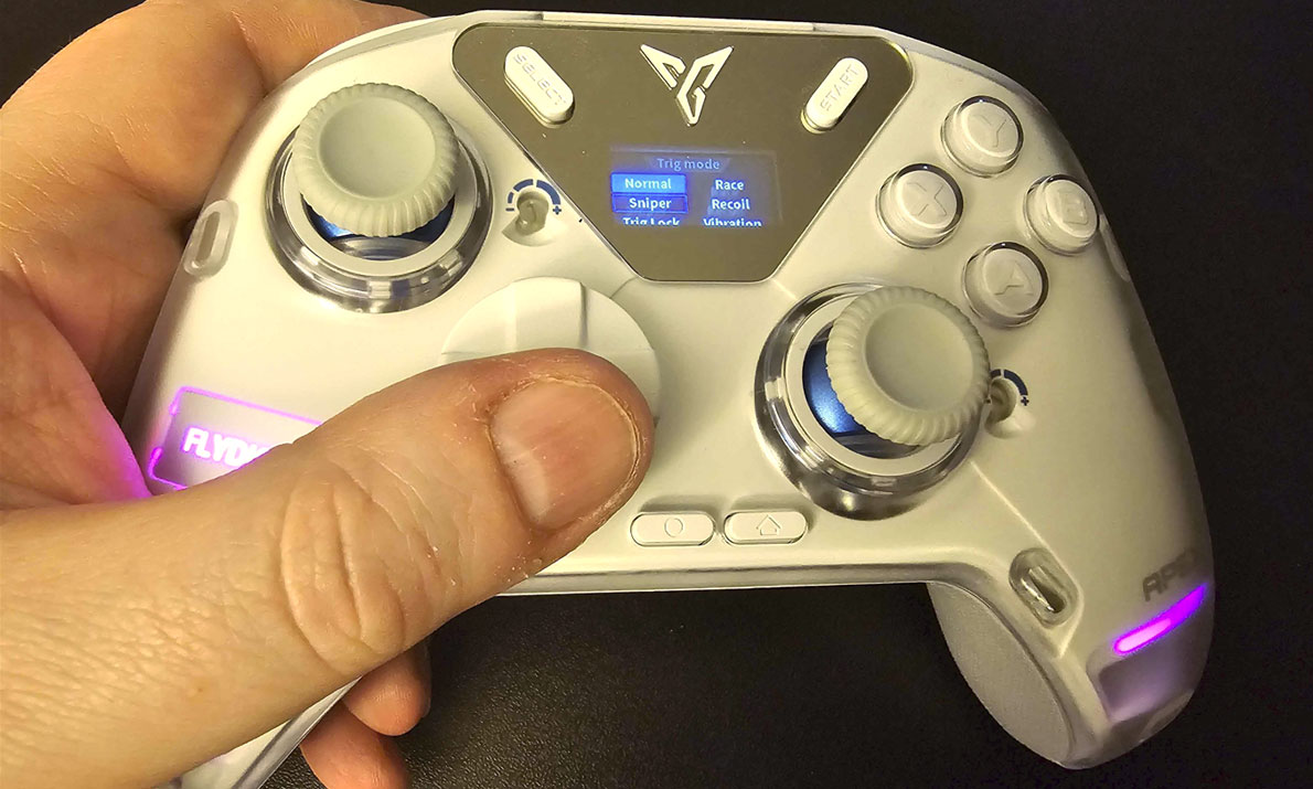 Or, at least that’s how it appears at first. one of the Apex 4’s coolest features is software-enabled haptic trigger buttons, what Flydigi refers to as force feedback triggers. However, while “force feedback” has historically referred to rumble features in controllers, that’s not what’s going on here. Rather, going into this controller’s settings menus (more on this later) lets you change one or both triggers to different modes that make them behave differently.