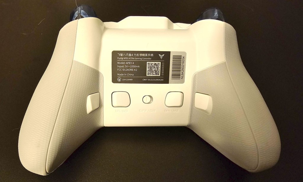 Flipping the controller over to look at its underside, we have four macro buttons, and an on/off switch. I’ll talk about the macro buttons in a moment, but first let’s talk about cross-compatibility.
