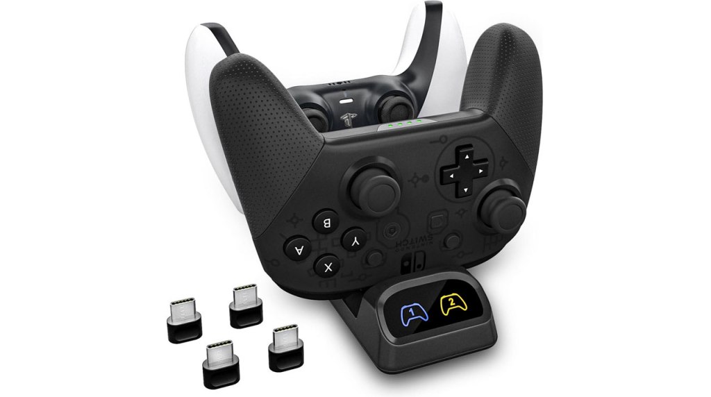 The dock itself has two slots for controllers, but comes with four small USB-C adapters that are plugged into the USB-C slot on your controller to make it compatible with the dock, meaning you can trade out two controllers you’re currently using and two you have charging, even if they’re all from different game platforms.
