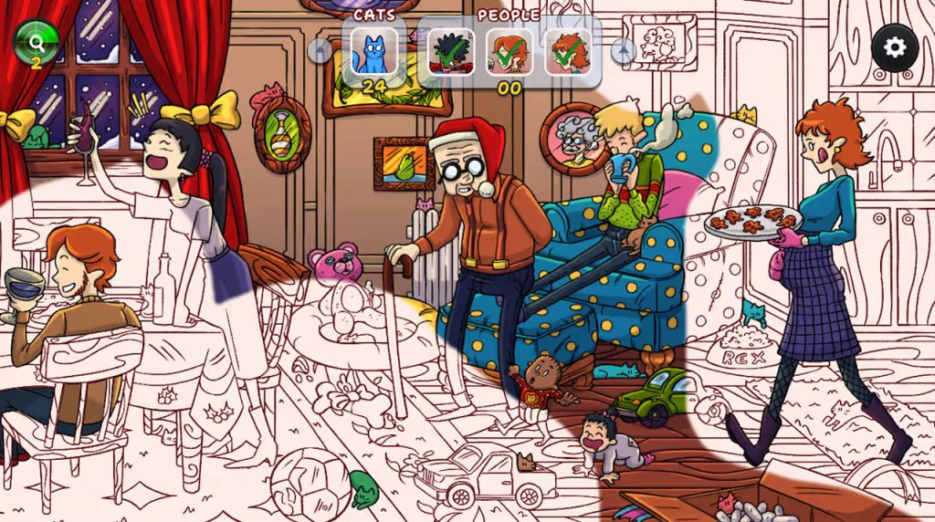 As for the presentation, the game uses a cartoony 2D art style that gradually colors in as you’re discovering hidden objects, with levels that have a fair amount of detail to them, and some nice animations, though these animations throw in contrast characters who are static and still even if they’re in the middle of an action. These visuals are backed by a lighthearted soundtrack that seems only vaguely Christmassy (you’ll hear occasional sleigh bells and such), but I’d say overall it suits the relaxed gameplay well enough. You’ll also hear occasional meows as you play, and in some cases other environmental noises.