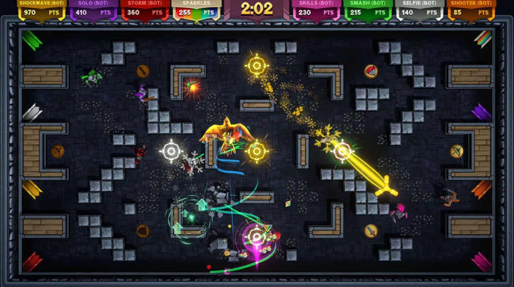 For the presentation, Knight Squad 2 replaces the 2D visuals of the first game with cartoony, fully-3D visuals fully of personality. And not only do these visuals look much better, but they’re far easier to parse and distinguish, improving the gameplay. This is backed by an epic instrumental soundtrack befitting the game’s theme, action, and silly humor very well. And of course, the Mortal Kombat/Unreal Tournament-style announcer makes his return as well.