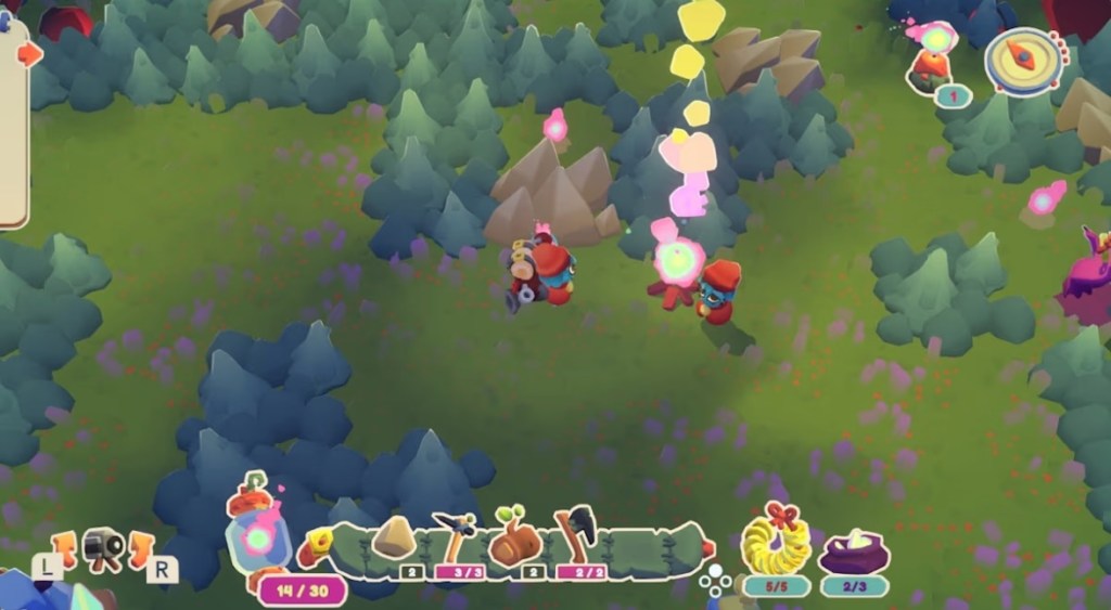 Much of the wilderness you explore is blocked off by forests, mountains, and other obstacles, but you can clear a tile of forest with an axe (gaining wood), and clear a tile of mountains with a pixckaxe (gaining stone). However, tools are scarce and break through use quickly, so you’ll need to be strategic about where you use them, carving paths through the wilderness you can use to reach other things instead of just hacking away at every tile and wasting your tools.