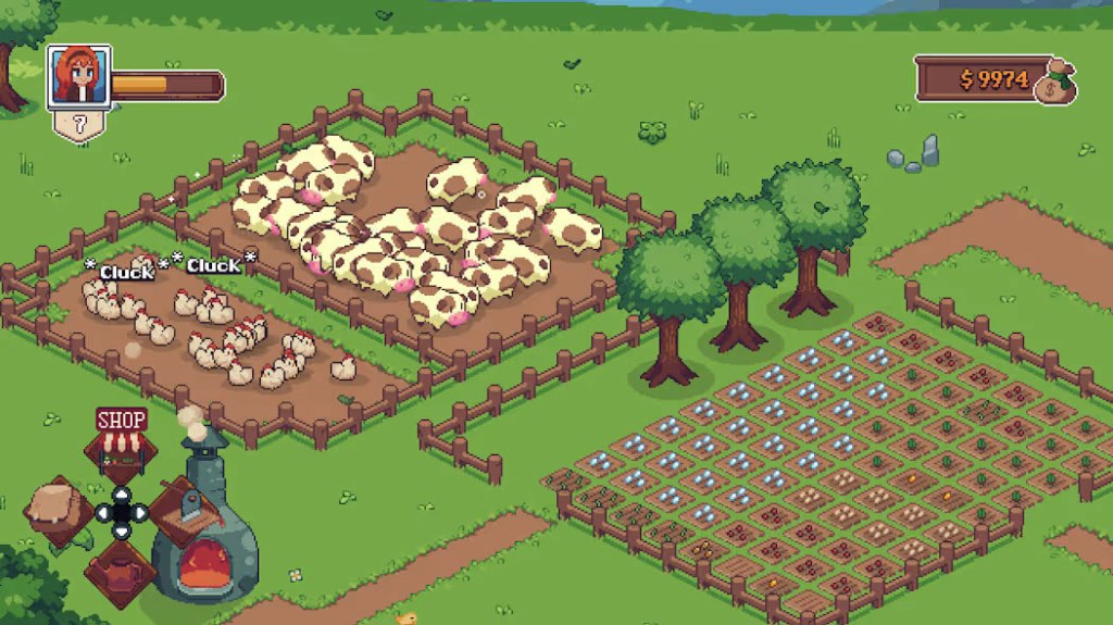 While the gameplay premise here seems directly inspired by games like Stardew Valley, this is much more simple than that. You’re not moving a character around (everything here is done via a cursor and menus), not building relationships with townsfolk, not following any sort of in-game calendar (at least not beyond following in-game days passed), not fishing or mining, not exploring the area, not upgrading your buildings and tools… all of that sort of depth has been stripped out of the game here.