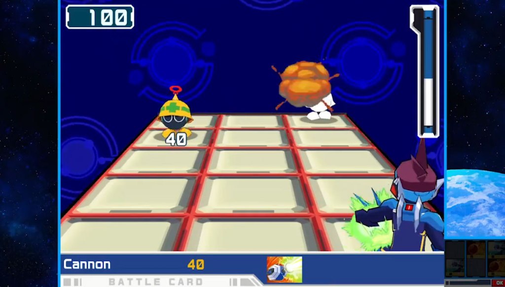 Apart from the space aliens, it’s a plot that isn’t too far divorced from the Mega Man Battle Network games, and likewise the gameplay is very similar, with battles taking a new behind-the-character perspective, and with the battle cadence going back and forth between selecting cards and then using them against enemies in live action in the series’ three-lane confrontations, but otherwise this is not very different from the Battle Network games.